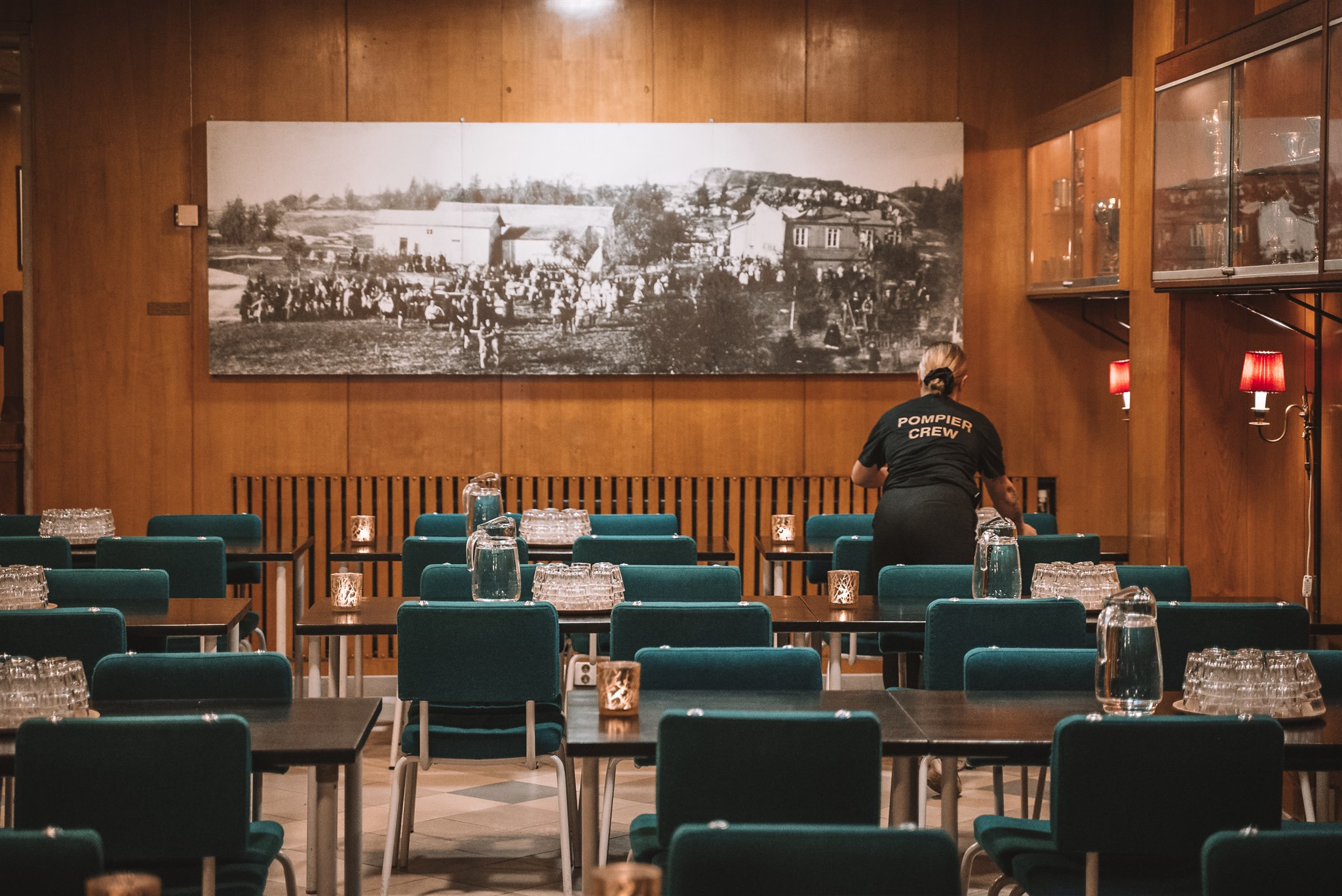 Pompier lounas tarjoillaan noutopöydästä sisältäen lisäkesalaatin ja lämpimän ruuan.